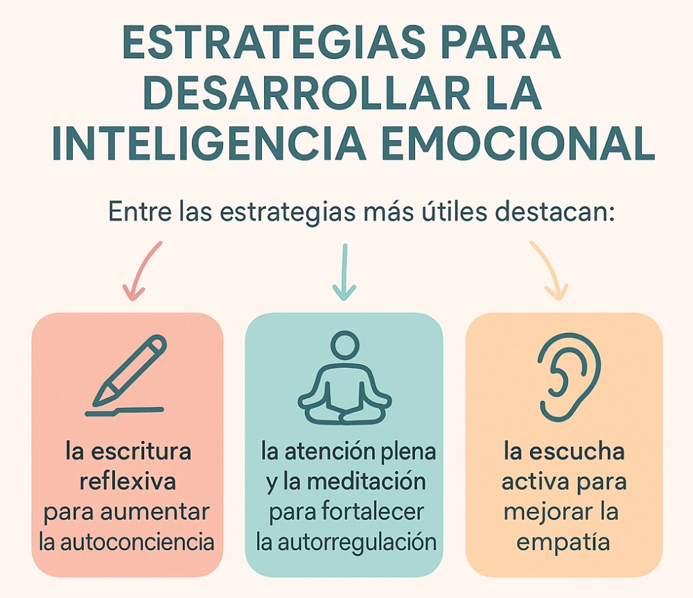 Entre las estrategias más útiles destaca la escritura reflexiva para aumentar la autoconciencia, la atención plena y la meditación para fortalecer la autorregulación, y la escucha activa para mejorar la empatía. El autor propone además planes de acción para incrementar el coeficiente emocional, que combinan la práctica de la comunicación asertiva, la lectura de señales no verbales y el control de impulsos.