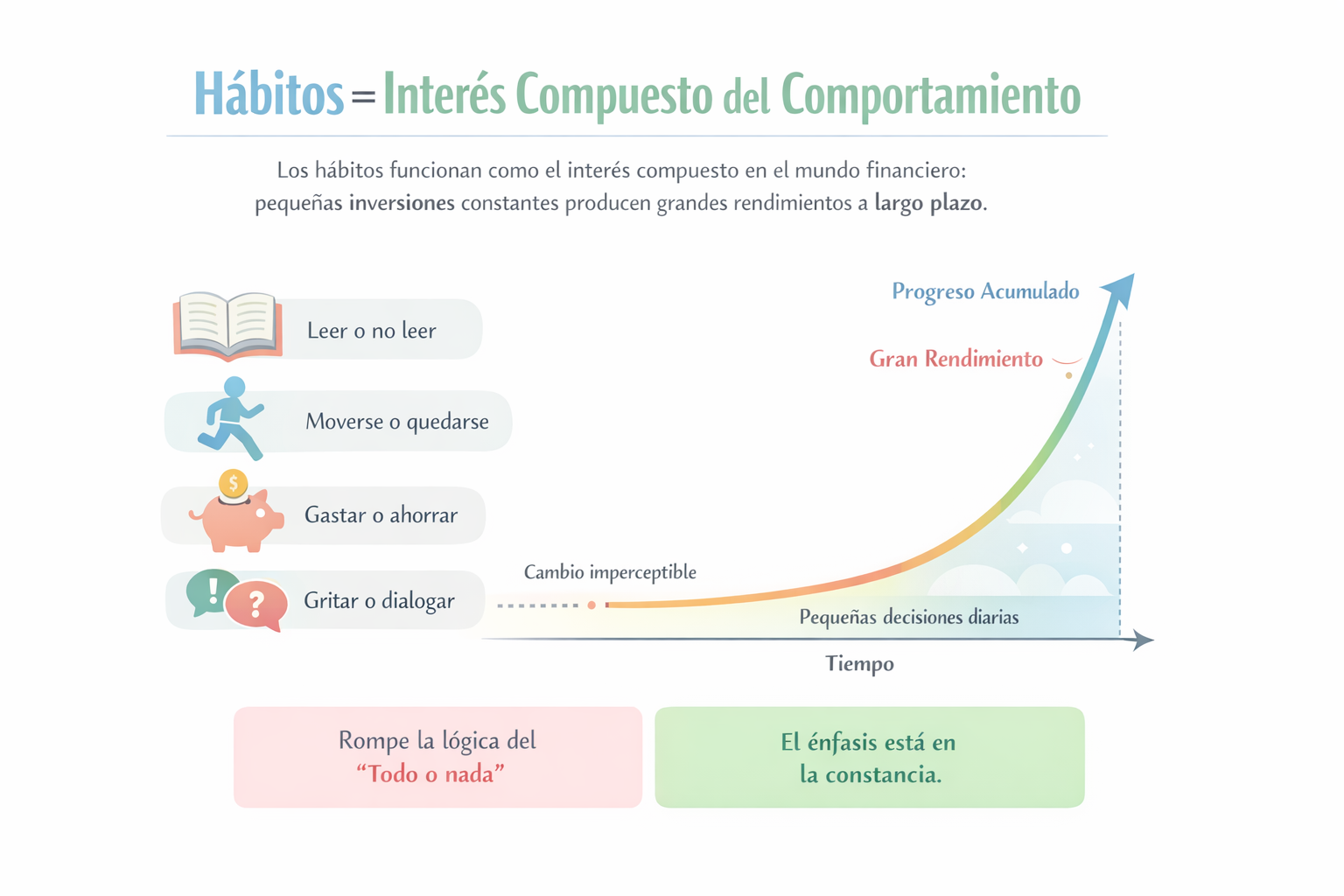 Clear explica que los hábitos funcionan como el interés compuesto en el mundo financiero: pequeñas inversiones constantes producen grandes rendimientos a largo plazo. Cada decisión cotidiana —leer o no leer, moverse o quedarse sentado, gastar o ahorrar, gritar o dialogar— es un depósito microscópico a favor de una versión futura de nosotros mismos. Al principio, el cambio es casi imperceptible, pero con el tiempo la curva se acelera. Esta visión rompe la lógica del “todo o nada” y coloca el énfasis en la constancia.