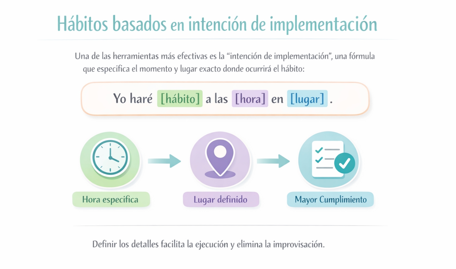 Los estudios muestran que declarar explícitamente la hora y el contexto aumenta significativamente la probabilidad de cumplir un hábito. La ambigüedad es el enemigo del cambio. Cuando definimos los detalles, facilitamos la ejecución y eliminamos la improvisación.