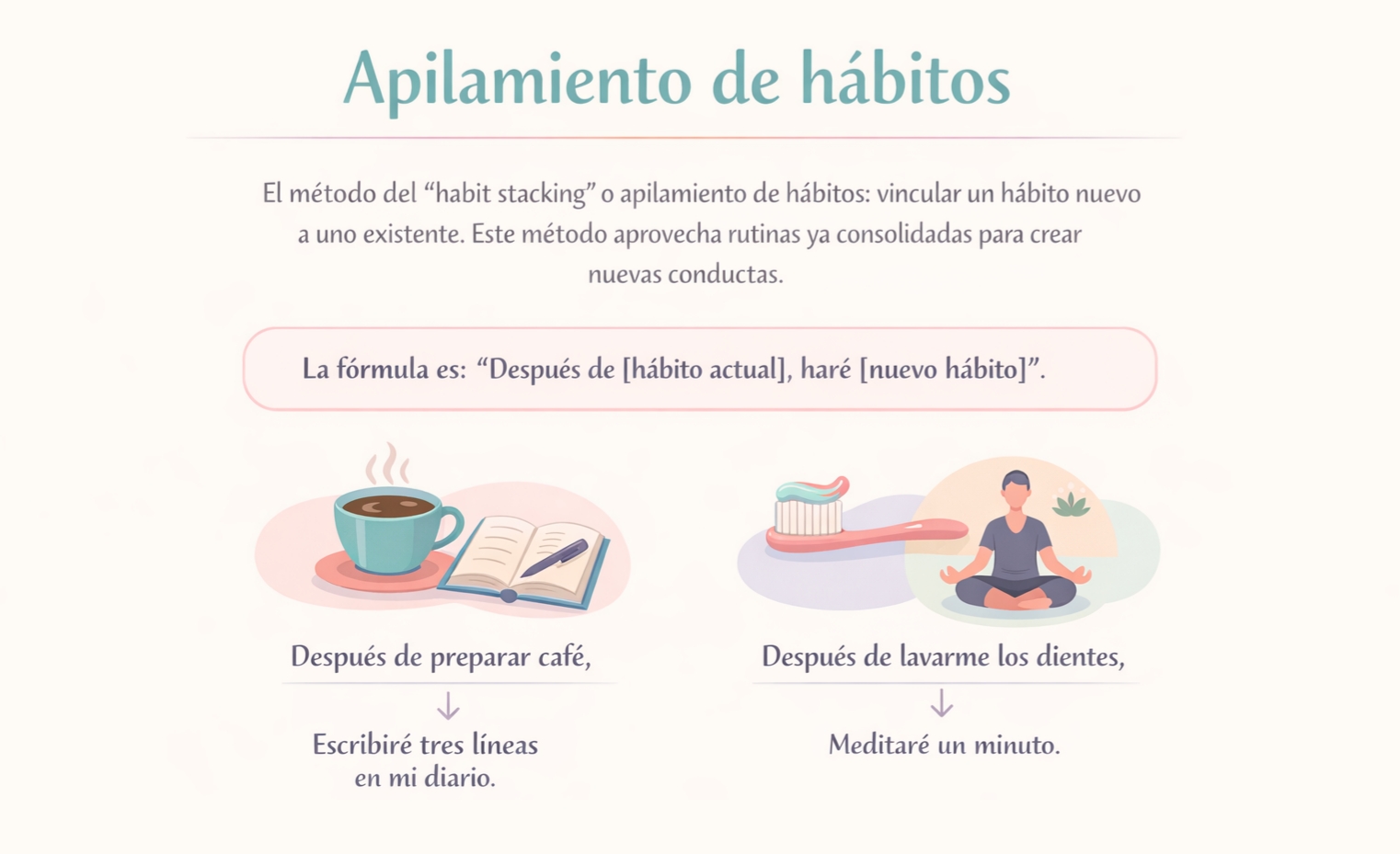 Este método funciona porque los hábitos existentes ya tienen un estímulo asociado. Al apilar un hábito nuevo sobre uno ya estable, reducimos la fricción y aumentamos la consistencia.