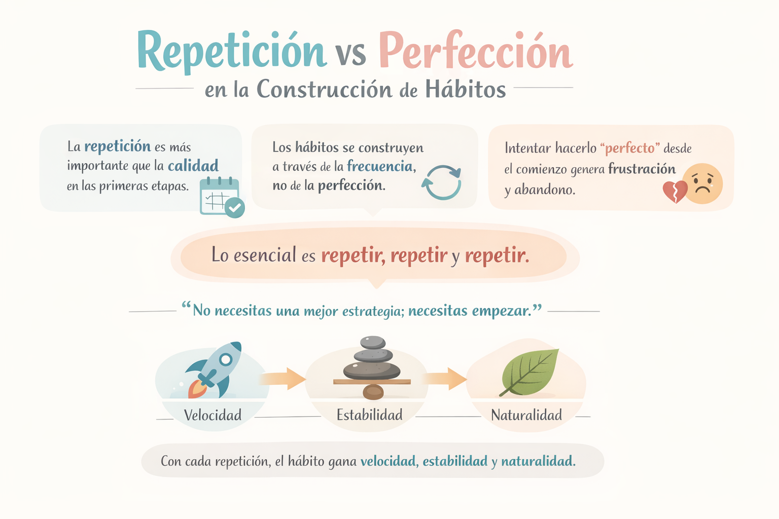 Clear enfatiza que la repetición es más importante que la calidad en las primeras etapas. Los hábitos se construyen a través de la frecuencia, no de la perfección. Intentar hacerlo “perfecto” desde el comienzo genera frustración y abandono. Lo esencial es repetir, repetir y repetir.
