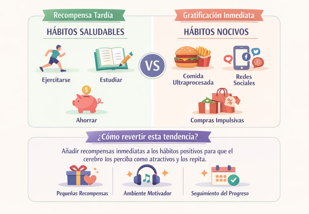 Clear explica que el cerebro está calibrado para priorizar recompensas instantáneas por encima de beneficios futuros, un legado biológico de nuestra evolución. Los hábitos saludables suelen ser de recompensa tardía (ej.: ejercitarse, estudiar, ahorrar), mientras que los hábitos nocivos ofrecen gratificación inmediata (ej.: comidas ultraprocesadas, redes sociales, compras impulsivas).