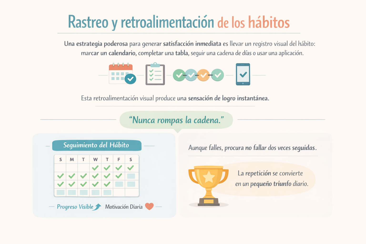 Clear destaca la regla: “Nunca rompas la cadena.” Incluso cuando falles, procura no fallar dos veces seguidas. El seguimiento hace visible el progreso, proporciona motivación y convierte la repetición en un pequeño triunfo diario.