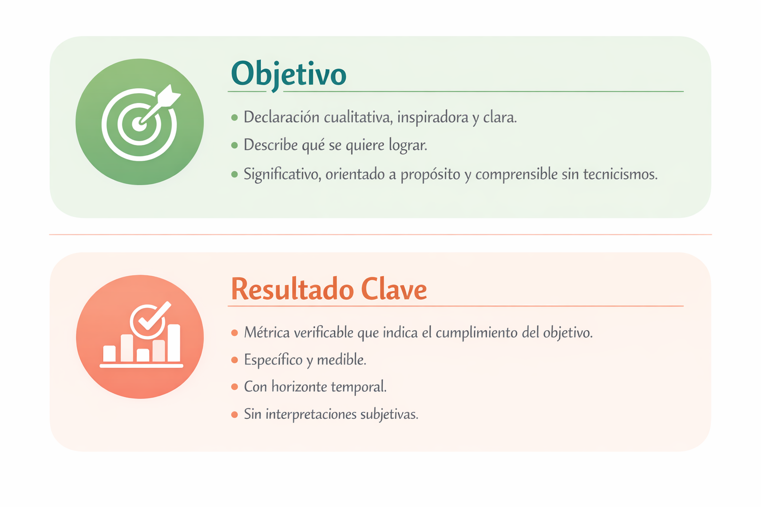 Un Resultado Clave es una métrica verificable que indica cómo sabremos que el objetivo se cumple. Es específico, medible, con horizonte temporal y sin interpretaciones subjetivas.