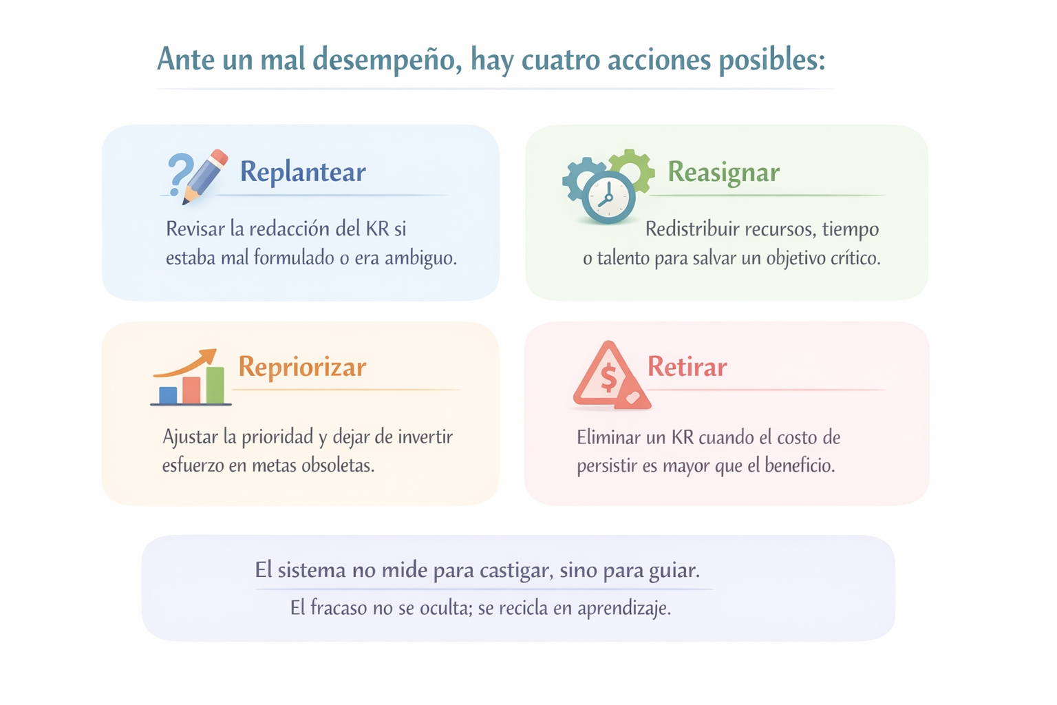 Los OKR promueven la sinceridad radical: si un KR no avanza, no se oculta. Ante un mal desempeño, hay cuatro acciones posibles: