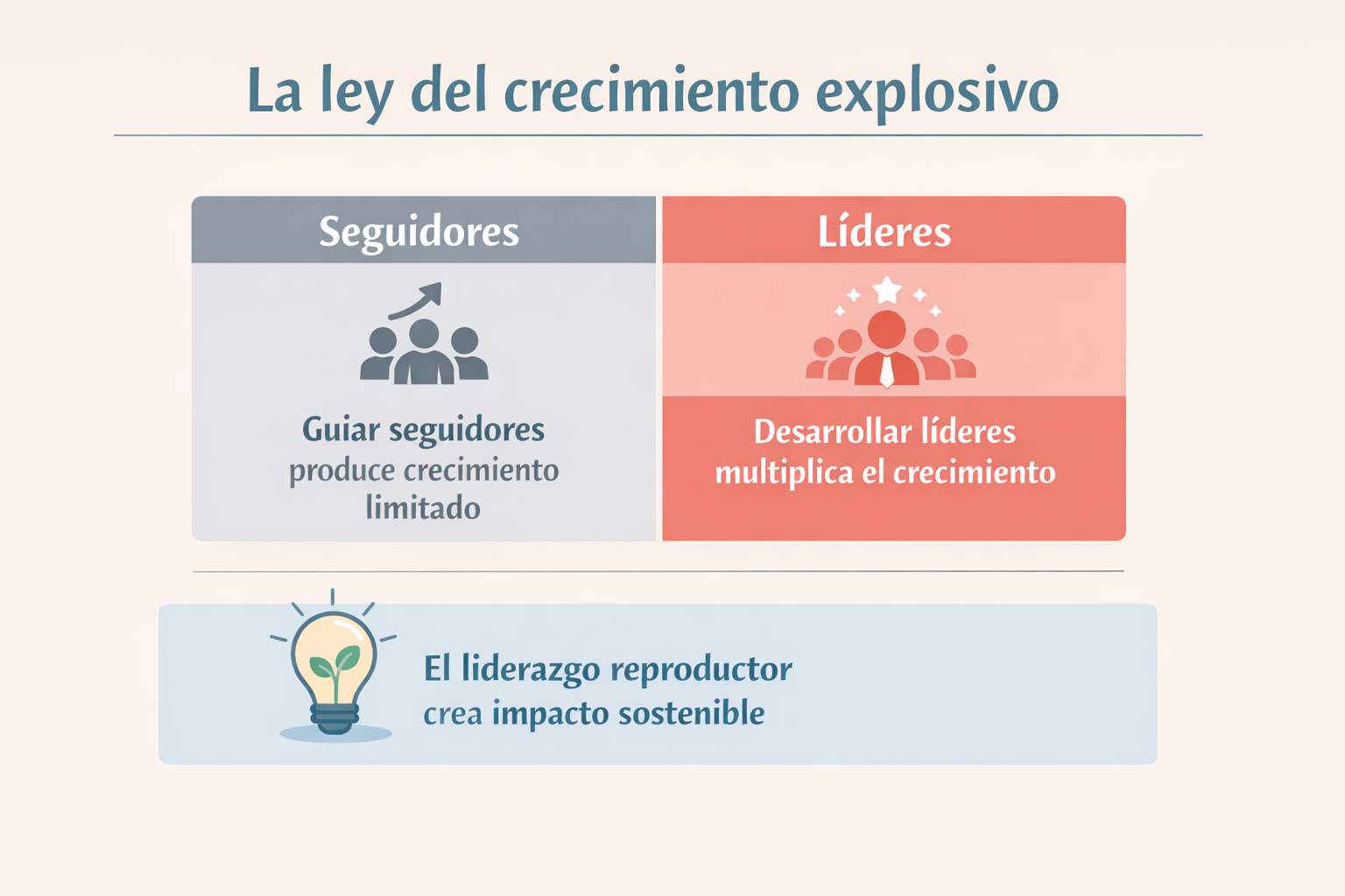 El gran error de muchos líderes es concentrar su energía en producir resultados, en lugar de reproducir liderazgo. Sin embargo, cuando el líder invierte en otros, el crecimiento deja de ser lineal y se vuelve exponencial. La capacidad de un equipo, un negocio o una comunidad se multiplica cuando los miembros empiezan a pensar, actuar y decidir como líderes.