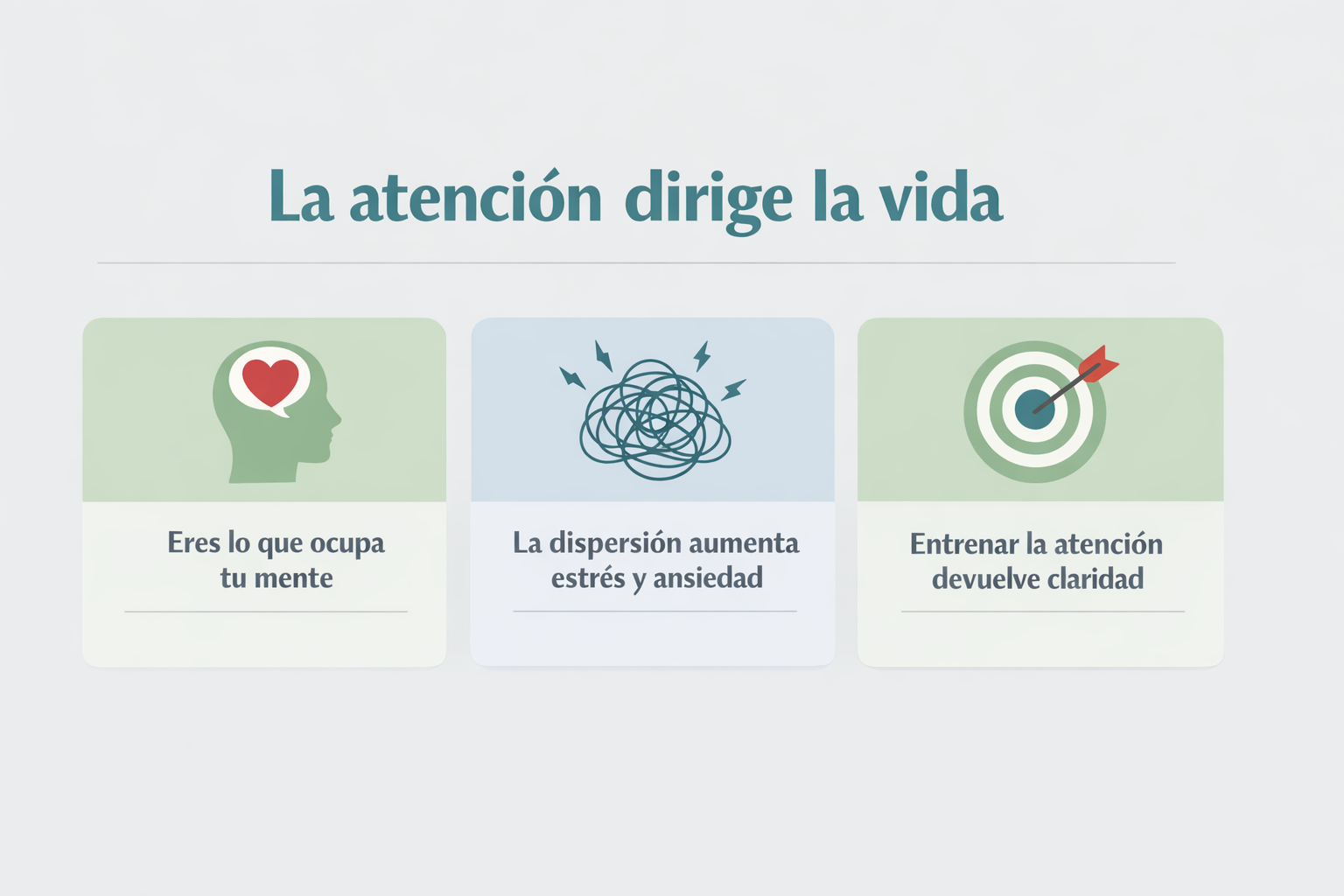 El entrenamiento de la atención es el proceso por el cual enseñamos a la mente a permanecer en un solo punto: una tarea, una conversación, una sensación o un pensamiento consciente. Implica reducir la impulsividad, calmar el ruido interno y devolver estabilidad a los procesos mentales.
