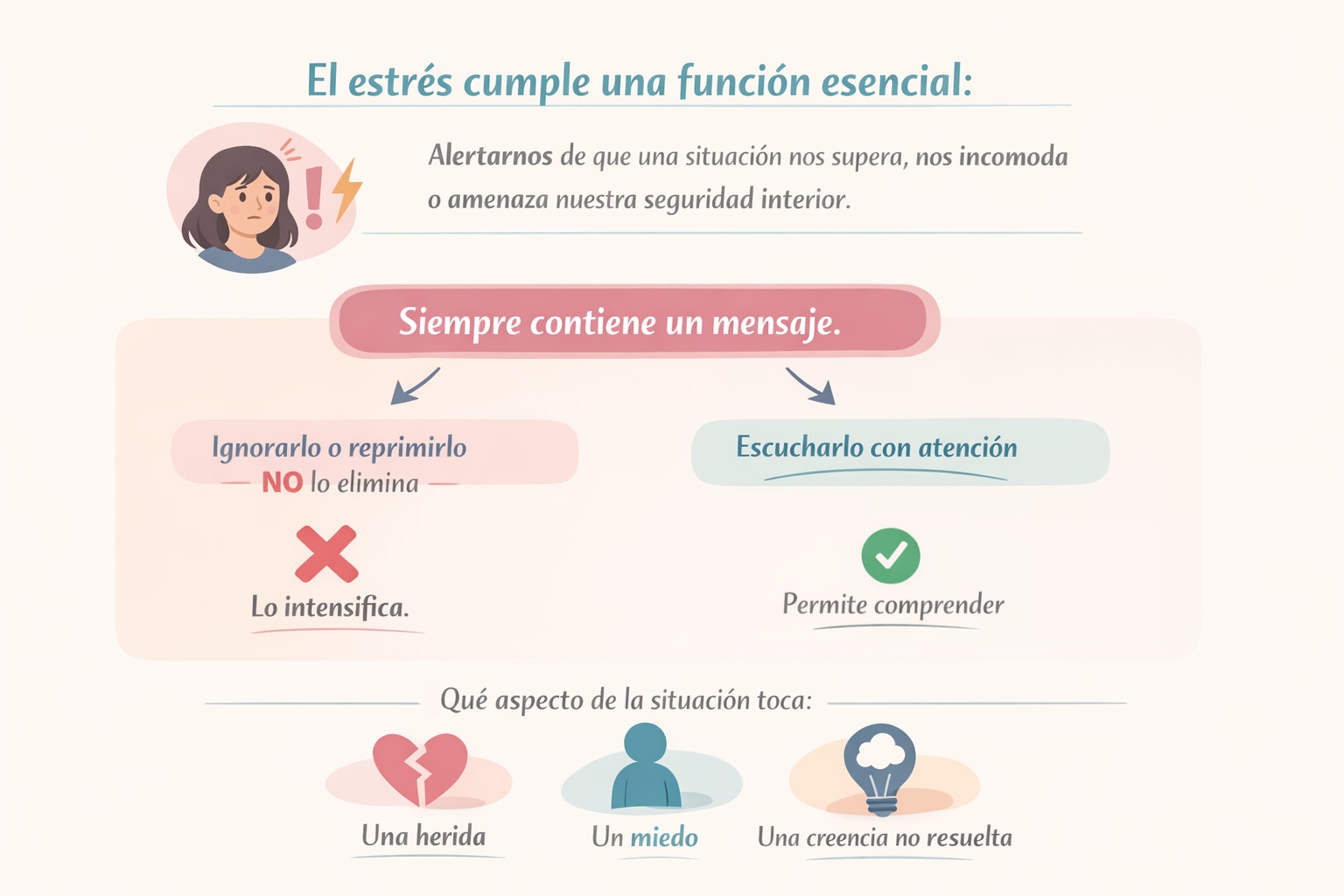 La autora insiste en que el estrés no aparece por azar. Siempre contiene un mensaje. Ignorarlo o reprimirlo no lo elimina; al contrario, lo intensifica. Escucharlo con atención permite comprender qué aspecto de la situación toca una herida, un miedo o una creencia no resuelta.