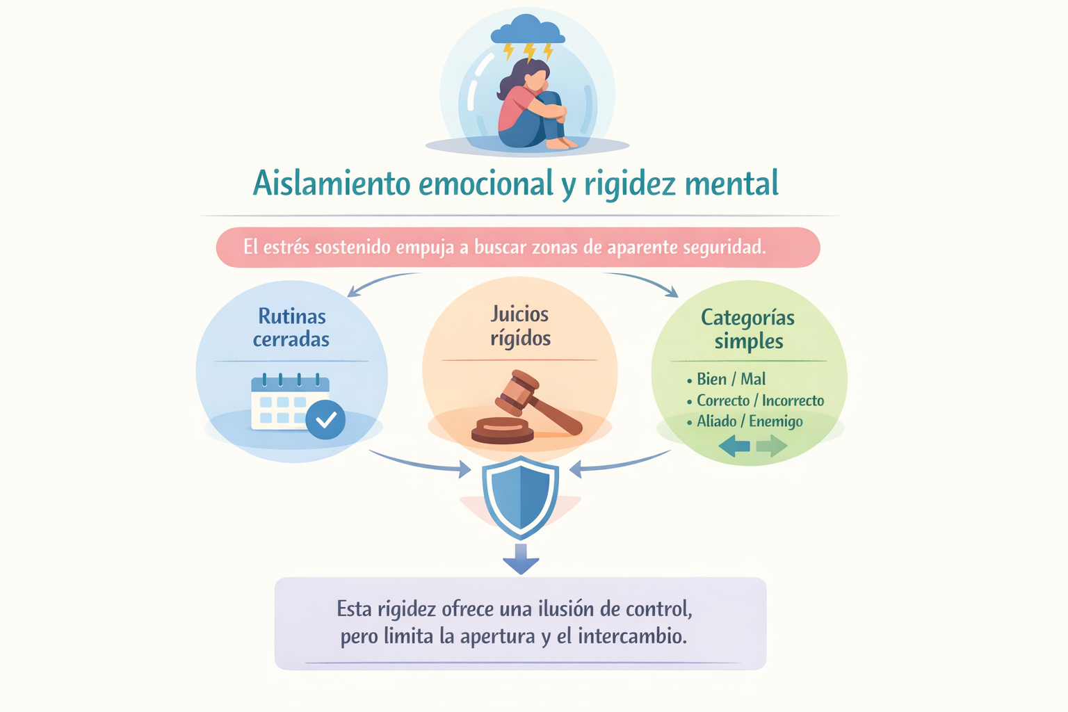 El estrés sostenido empuja a buscar zonas de aparente seguridad. La persona se encierra en rutinas, juicios rígidos y categorías simples: bien/mal, correcto/incorrecto, aliado/enemigo. Esta rigidez ofrece una ilusión de control, pero limita la apertura y el intercambio.