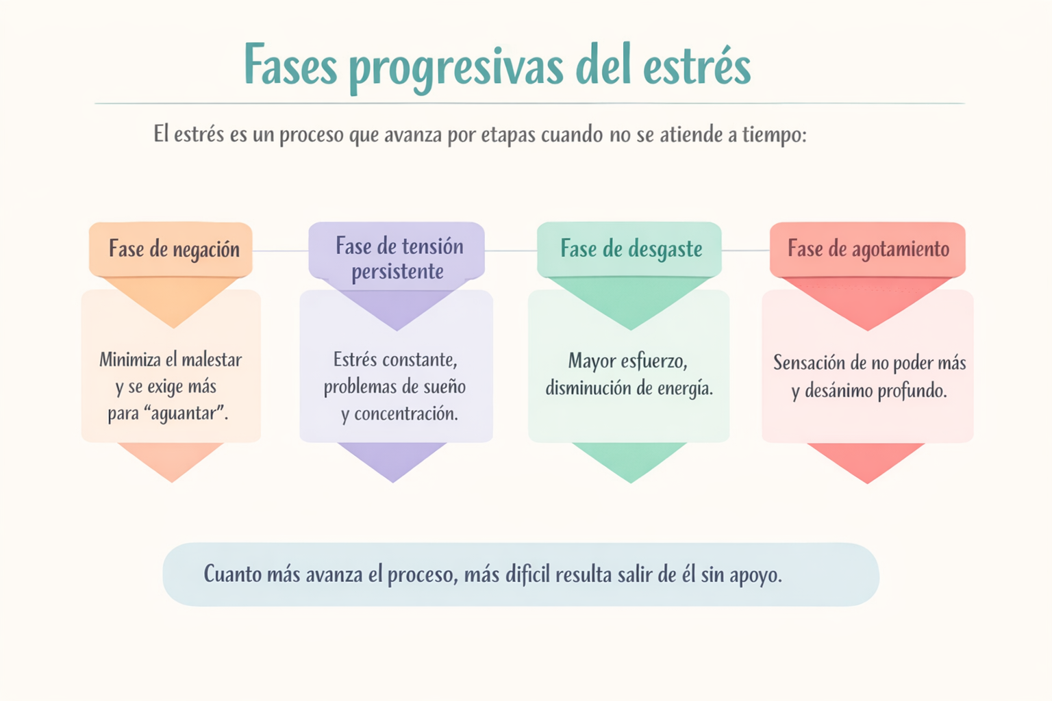 La autora describe el estrés como un proceso que avanza por etapas cuando no se atiende a tiempo: