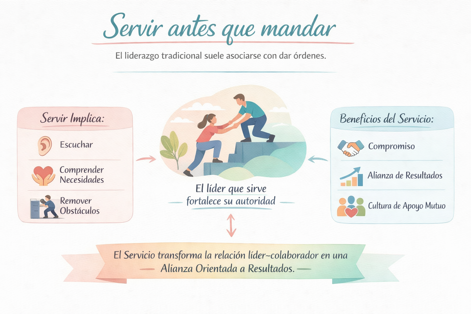 El líder que sirve no pierde autoridad; la fortalece. Al priorizar el bienestar y el crecimiento del equipo, genera compromiso genuino y una cultura de apoyo mutuo. El servicio transforma la relación líder–colaborador en una alianza orientada a resultados.