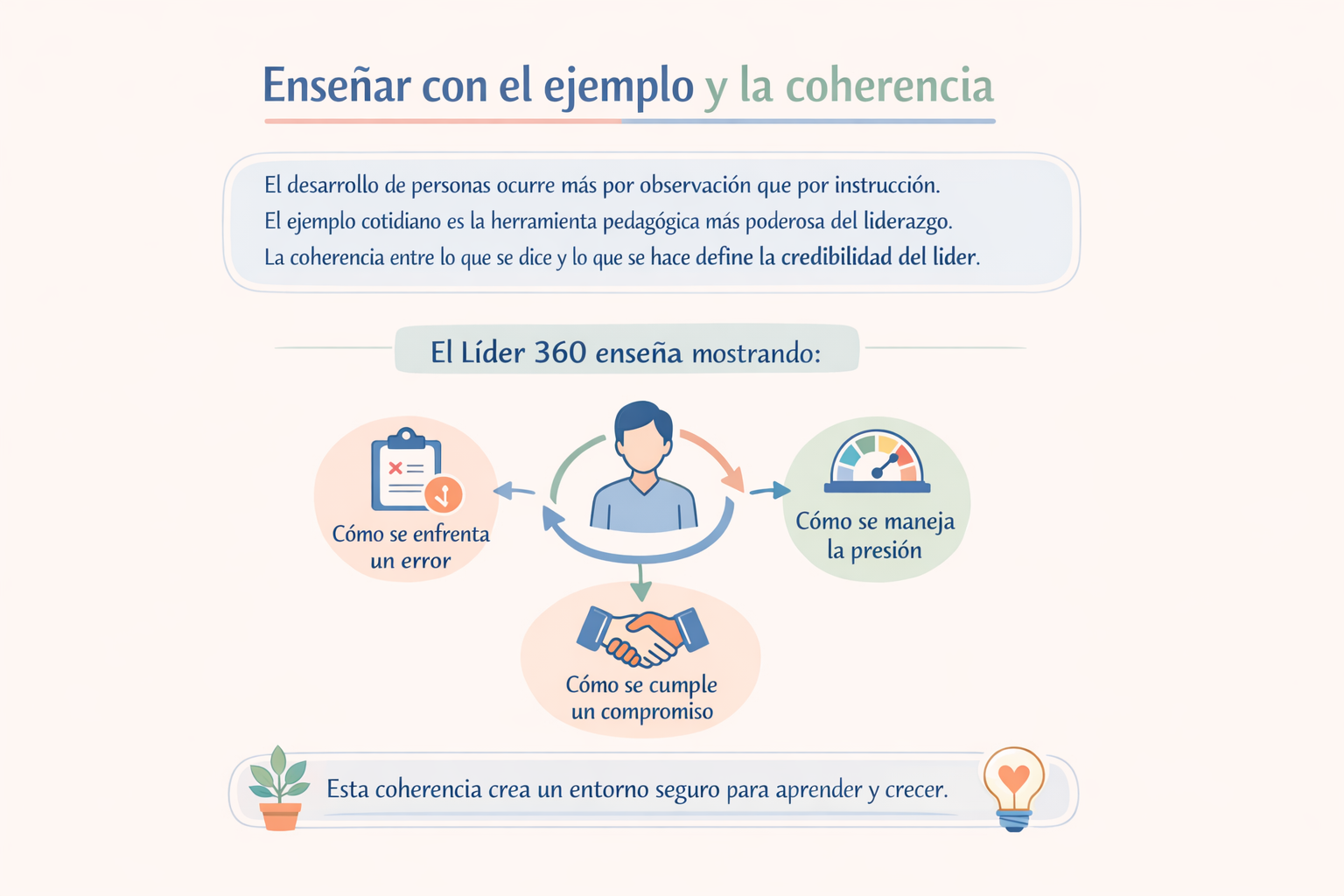 El líder 360 enseña mostrando: cómo se enfrenta un error, cómo se maneja la presión, cómo se cumple un compromiso. Esta coherencia crea un entorno seguro para aprender y crecer.
