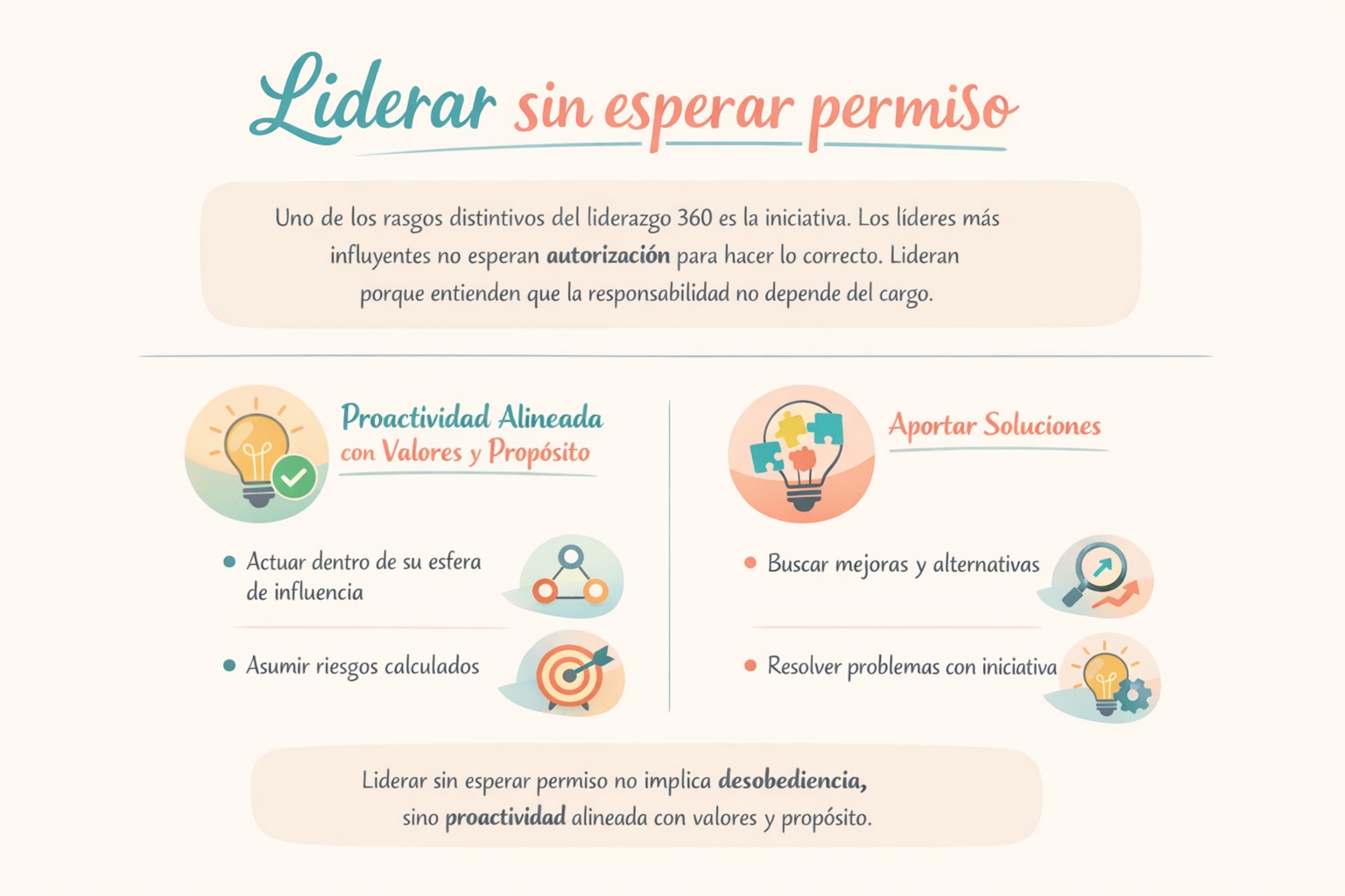 Liderar sin esperar permiso no implica desobediencia, sino proactividad alineada con valores y propósito. El líder 360 actúa dentro de su esfera de influencia, asumiendo riesgos calculados y aportando soluciones.