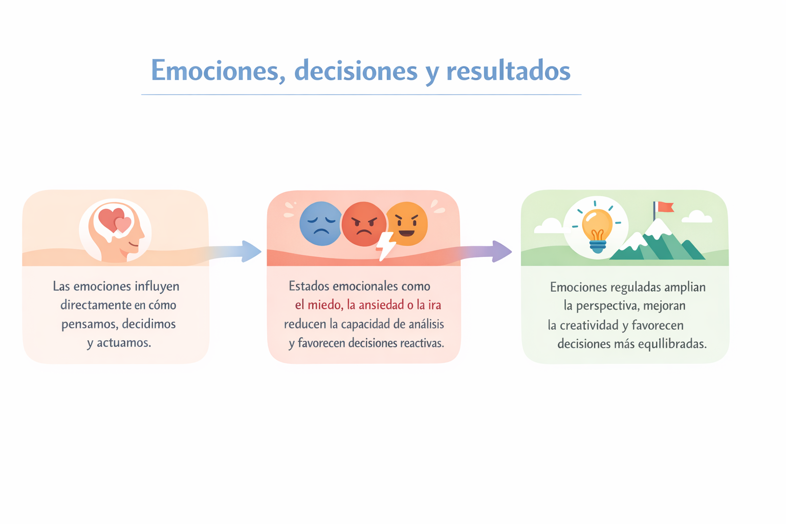 Las emociones influyen directamente en los procesos cognitivos. Estados emocionales como el miedo, la ansiedad o la ira reducen la capacidad de análisis, nublan el juicio y favorecen decisiones reactivas. Por el contrario, emociones reguladas amplían la perspectiva, mejoran la creatividad y favorecen decisiones más equilibradas.