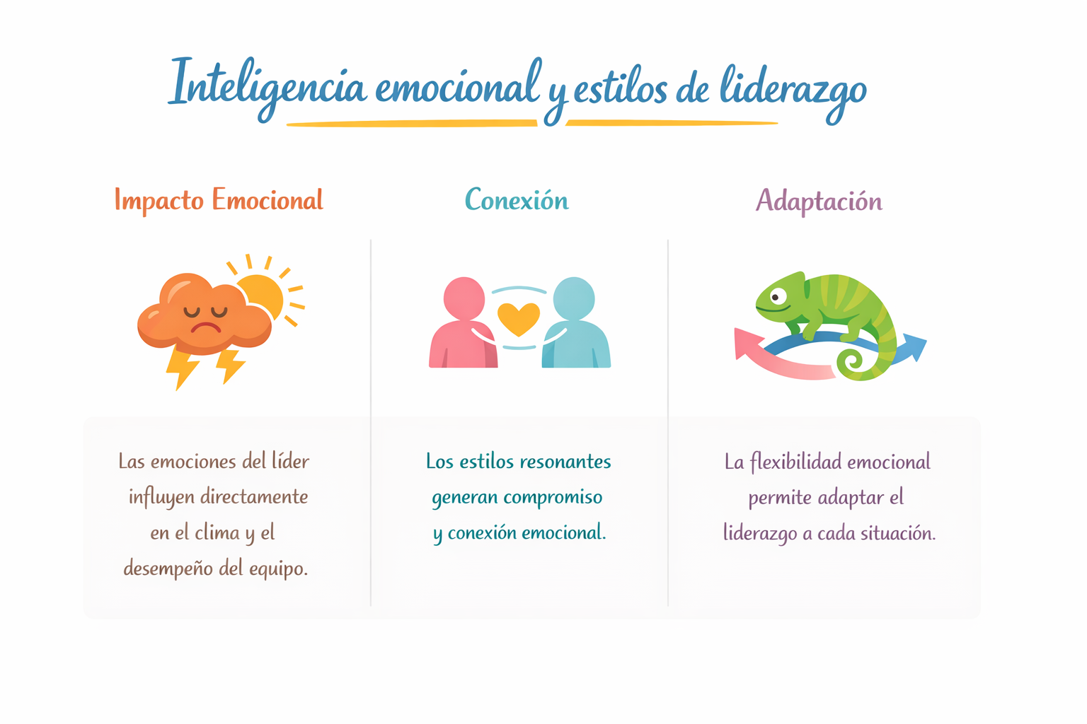 La inteligencia emocional permite al líder adaptar su estilo a cada situación. Goleman destaca que no existe un único estilo de liderazgo eficaz, sino la capacidad de alternar enfoques según el contexto, el equipo y el desafío.