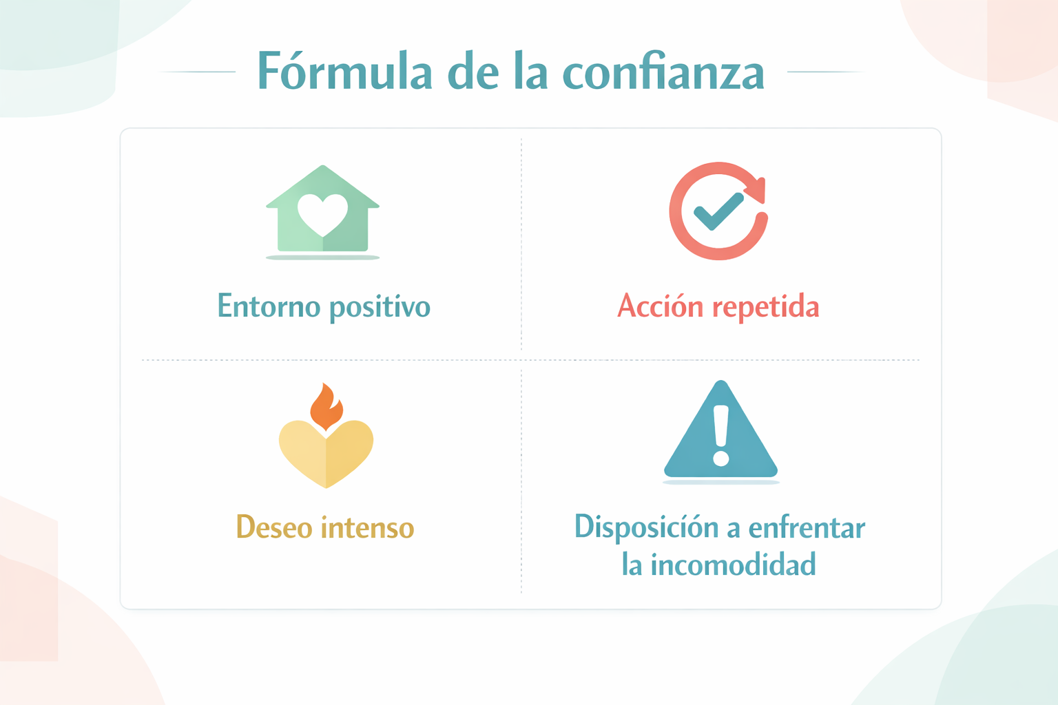 La confianza en uno mismo no depende del talento ni de las circunstancias externas, sino de la capacidad de creer en uno mismo y actuar de forma coherente con esa creencia. El libro explica que las dudas prolongadas erosionan la identidad y reducen los resultados, mientras que las acciones repetidas, aunque pequeñas, construyen evidencia interna y fortalecen la autoconfianza. Meurisse introduce una fórmula práctica basada en cuatro pilares —entorno positivo, acción repetida, deseo intenso y disposición a enfrentar la incomodidad— que permite desarrollar una confianza funcional, aplicable a objetivos personales, profesionales y relacionales. La propuesta central es clara: la confianza se construye, no se espera.