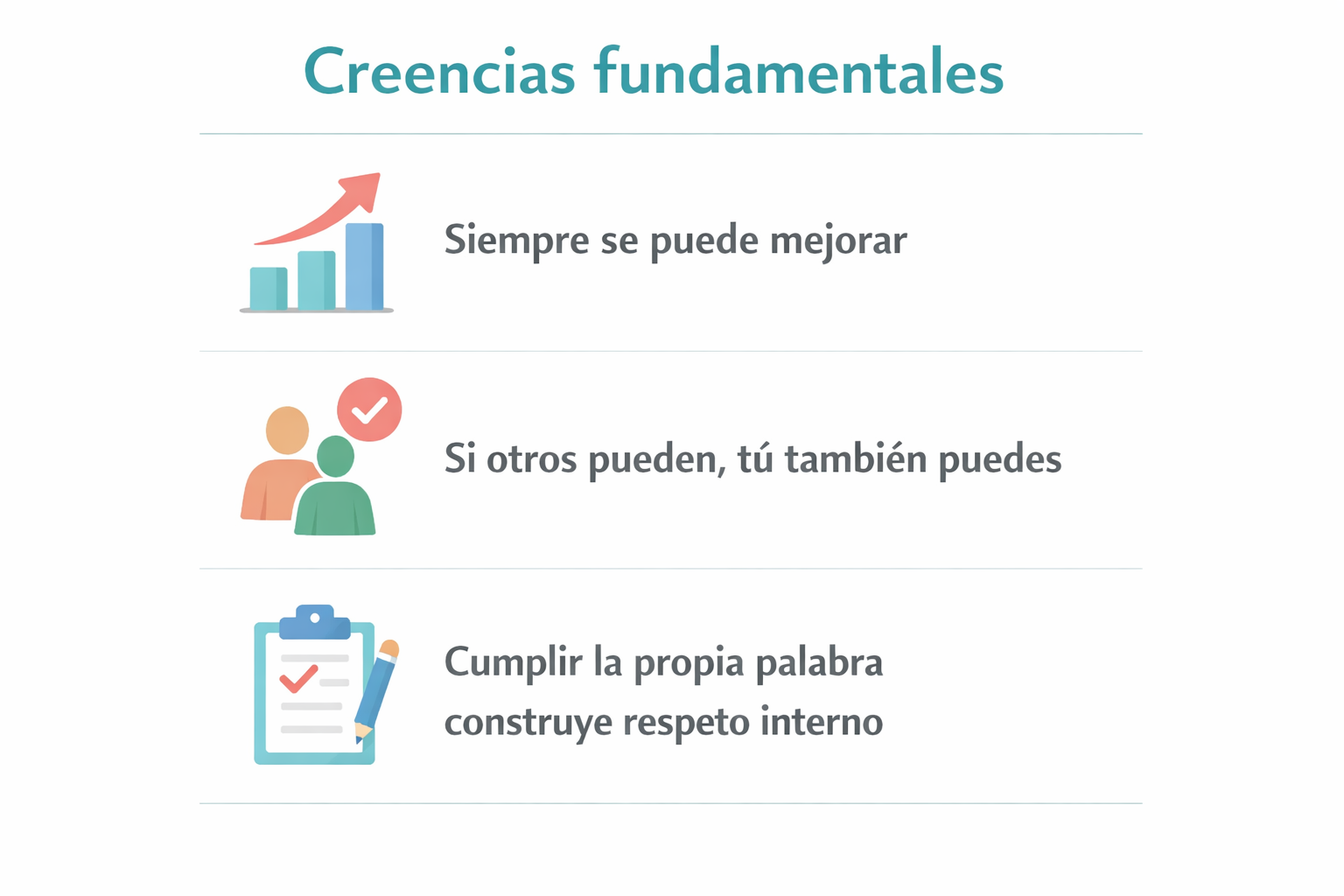 Meurisse propone un conjunto de creencias base que fortalecen la confianza, como la idea de que siempre se puede mejorar, que si otros pueden tú también puedes, y que cumplir la propia palabra es clave para construir respeto interno.