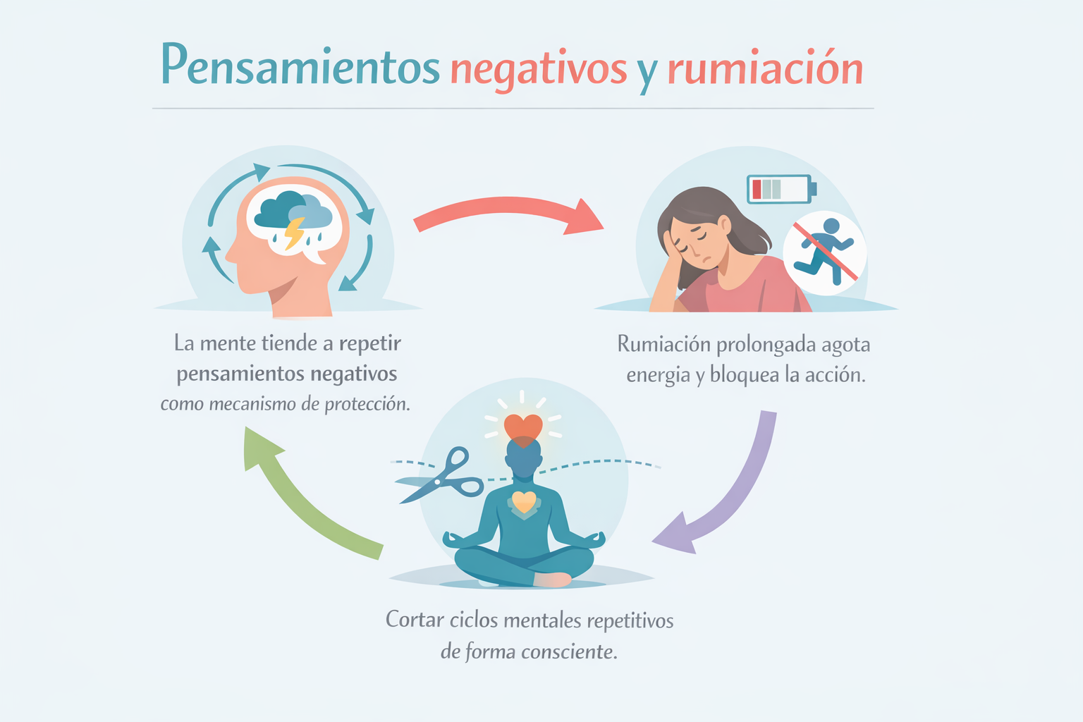 La mente tiende a repetir pensamientos negativos como mecanismo de protección. Sin embargo, la rumiación prolongada agota energía y bloquea la acción.