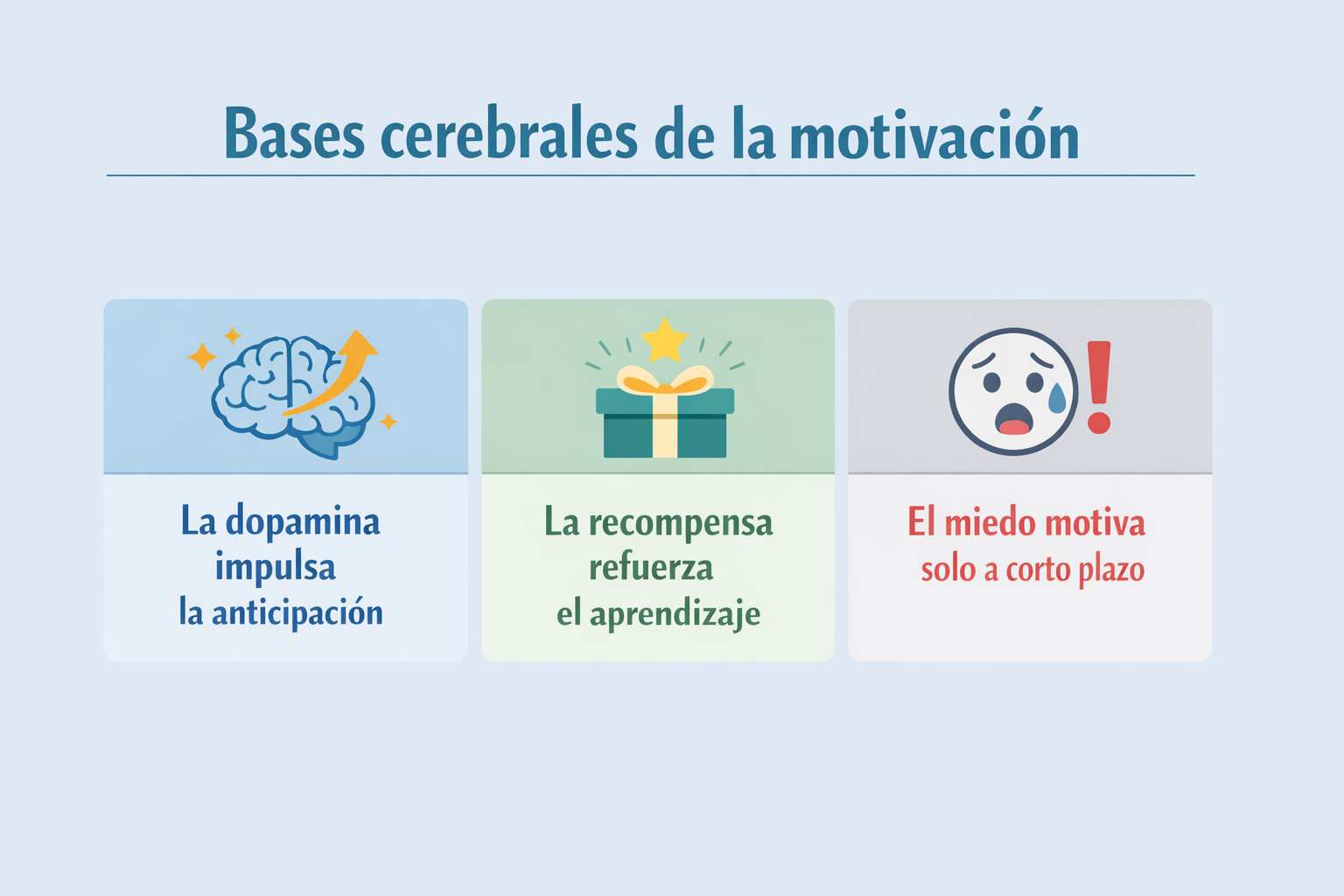 La motivación tiene bases cerebrales claras. La dopamina impulsa la anticipación de recompensas y el aprendizaje, mientras que el miedo puede funcionar como motivador a corto plazo si se usa con cuidado.