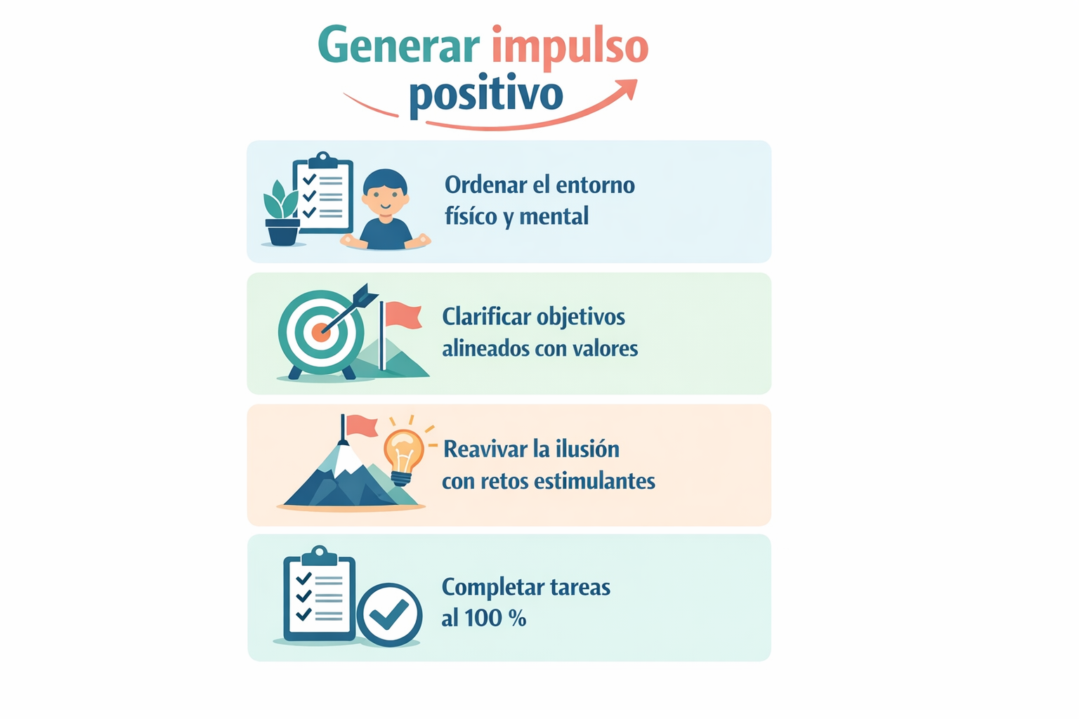 El autor propone ordenar el entorno físico y mental para reducir distracciones, clarificar objetivos alineándolos con valores y motivadores personales (autonomía, maestría o propósito), reavivar la ilusión mediante retos estimulantes y dar el salto a la acción aunque no te sientas preparado. Completar tareas al 100 % refuerza la autoestima y genera una cadena de acción continua.