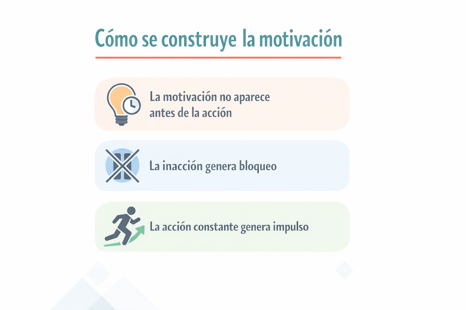 El libro explica que la falta de motivación suele ser consecuencia de la inacción, el exceso de pensamiento y la desconexión entre los objetivos y los motivadores personales. Para salir del bloqueo, Meurisse propone aceptar la situación actual sin castigarse, observar los hechos con objetividad y tomar distancia emocional. A partir de ahí, plantea generar impulso positivo mediante acciones pequeñas pero completas: ordenar el entorno físico y mental, clarificar prioridades, reavivar la ilusión con retos significativos y terminar lo que se empieza. Una vez que el impulso está en marcha, el foco pasa a mantener la inercia: reconocer logros, comprometerse públicamente, diseñar el entorno para reducir distracciones y actuar de forma deliberada. El libro cierra con veinticinco estrategias simples que permiten recuperar la motivación en momentos de caída y recordar que la acción constante es el verdadero motor del cambio.
