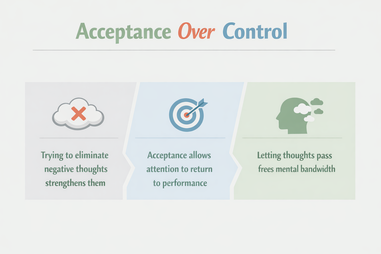 Trying to eliminate negative thoughts strengthens them. Acceptance allows attention to return to performance tasks.