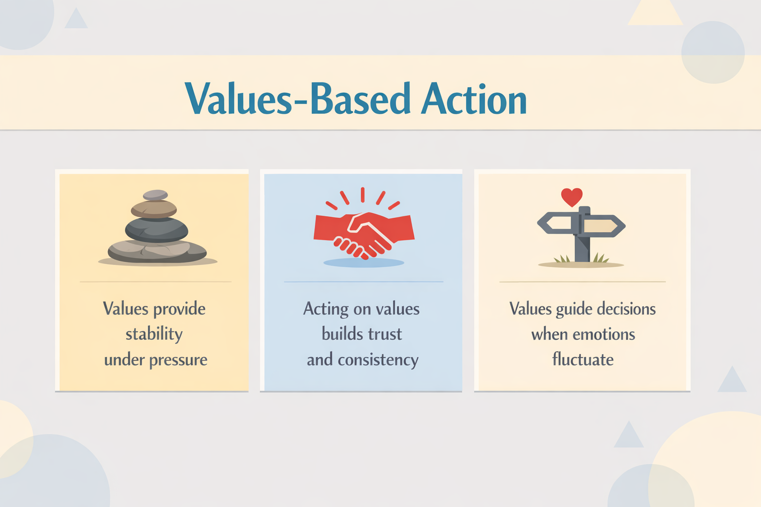 Values provide stability when emotions fluctuate. Acting according to values builds trust and consistency.