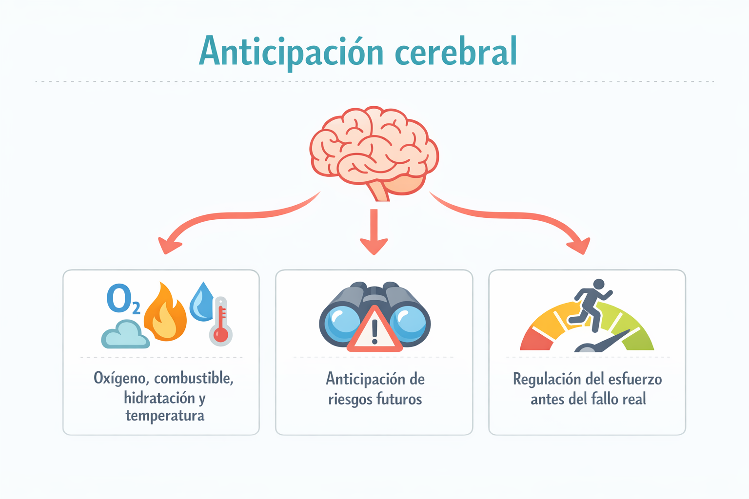 Oxígeno, combustible, hidratación y temperatura siguen siendo relevantes, pero influyen a través de la anticipación cerebral. El cerebro reduce el esfuerzo antes de que se alcancen niveles críticos.