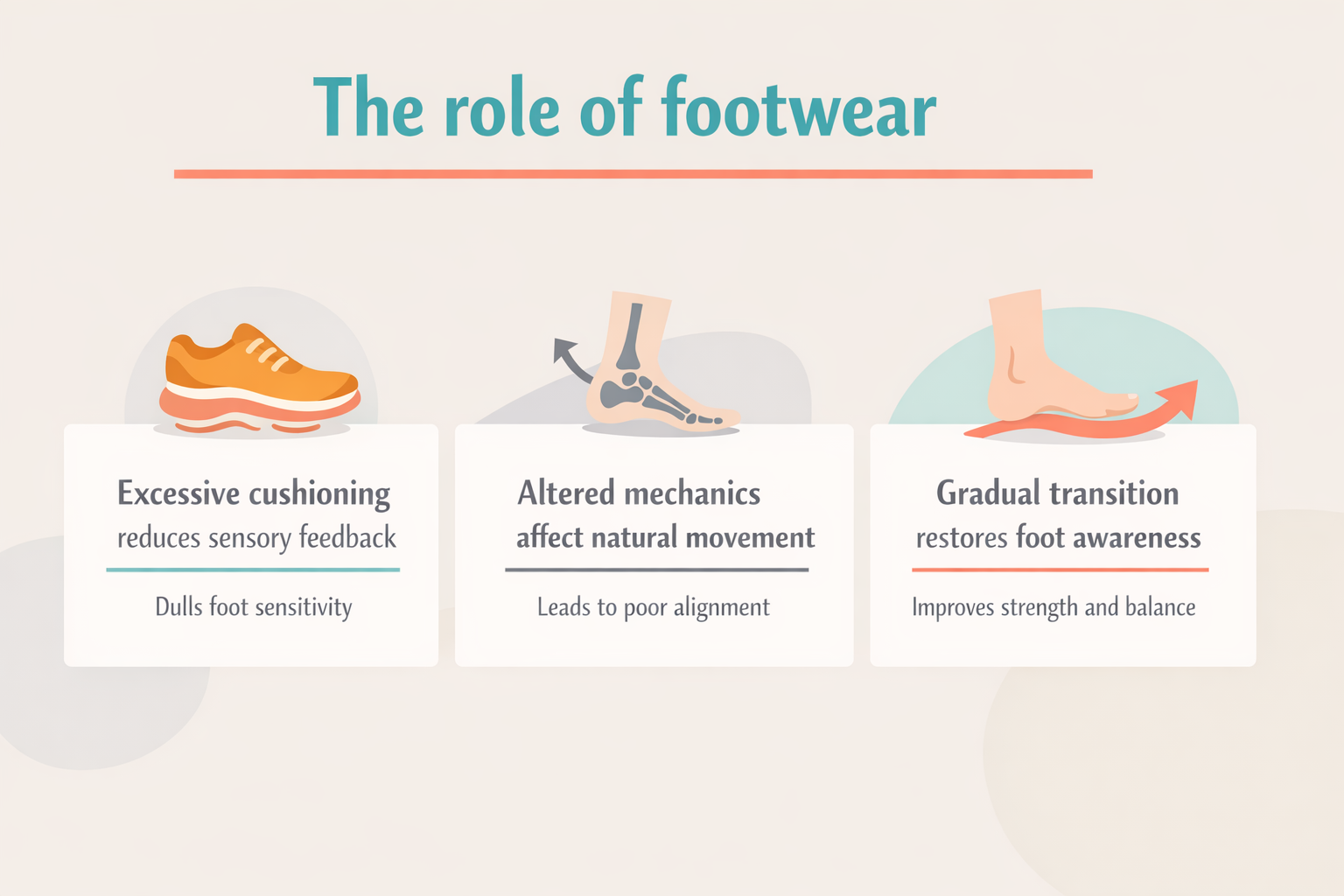 Highly cushioned shoes may reduce sensory feedback and alter natural mechanics. The book encourages questioning excessive cushioning and gradually restoring foot awareness.