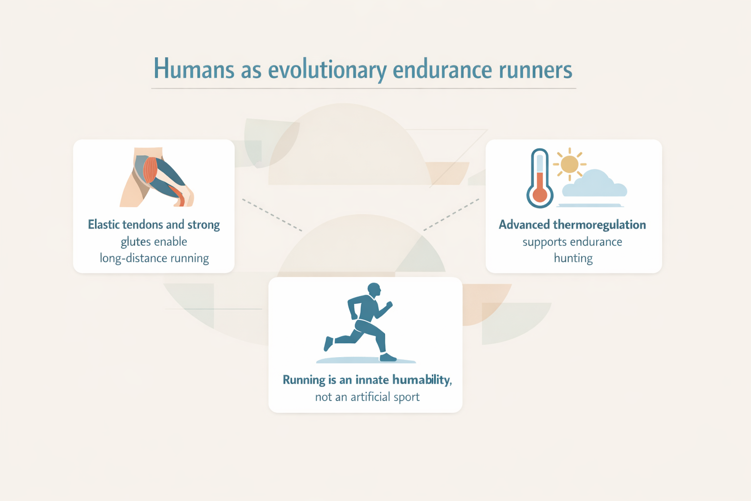 The human body evolved for long-distance running: elastic tendons, strong glutes, and advanced thermoregulation enabled endurance hunting and survival. Running is not an artificial sport but an innate human capability.